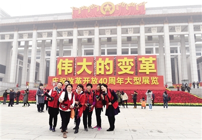 11月14日,观众在国家博物馆前合影留念。11月13日,“伟大的变革——庆祝改革开放40周年大型展览”在国家博物馆开幕。■新华社发
