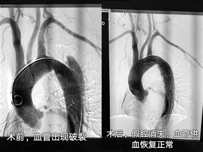 待患者血压稳定下来后,于1月23日,该院介入导管室主任全昌发、心胸外科主任肖劲莎、心内科副主任何勇等胸痛中心专家为其进行了历时2个多小时主动脉覆膜支架植入手术。目前,患者胸痛症状缓解,生命体征平稳,血压、心率已达目标范围,愈后效果良好。