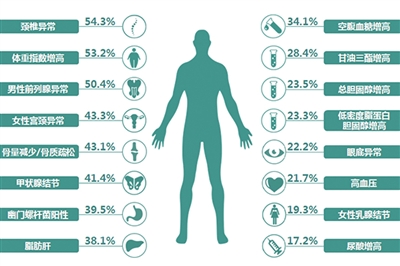 在13项男性及女性都存在的异常指标中,男性公务员检出率高于女性公务员的异常指标有9项,可以说,男性公务员的健康是“压力山大”了。