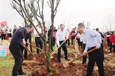 3月19日下午,湖南财工院党委书记高楚云、院长戴旻带领百余名师生在狮山公园开展义务植树志愿者活动。大家一起挥锹培土、提水浇树,经过近一个小时的劳动,共植树200余株,为狮山公园增添一抹新绿。 ■通讯员 唐文 刘毅 摄