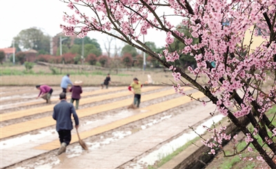 当前正值水稻育秧时节,田园一片忙碌景象。据悉,今年衡阳县计划发展优质稻120万亩,其中高档优质稻50万亩。图为西渡镇梅花村农民正在铺设秧盘进行水稻播种、育秧,为后期全面插秧做好准备。■刘欣荣 摄