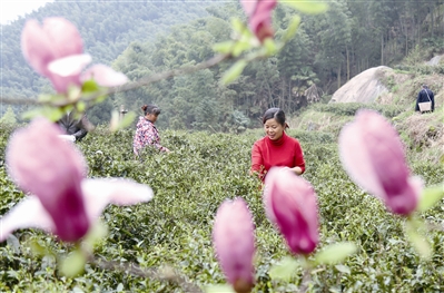 4月1日,南岳区寿岳乡的村民在采摘春茶。当日,南岳区天气晴好。位于南岳区寿岳乡十里茶乡的春茶进入采摘季,茶农们趁着晴好天气开采明前茶,十里茶乡一派人勤春早的景象。 ■文兰 摄