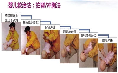 方法四,应用于婴幼儿:使幼儿平卧,面向上,躺在坚硬的地面或床板上,抢救者跪下或立于其足侧,使幼儿骑在抢救者的两大腿上,面朝前。抢救者以两手的中指或食指,放在患儿胸廓下和肚脐上的腹部,快速向上重击压迫,但要很轻柔。重复之,直至异物排出。