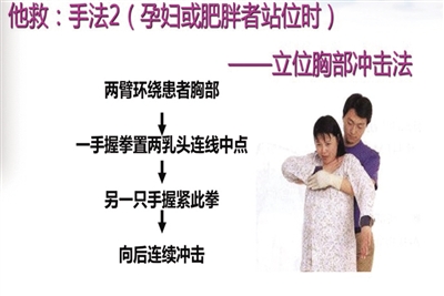 方法二,应用于孕妇:一、抢救者站在病人背后,用两手臂环绕病人的胸部;二、一手握拳,将拳头的拇指一侧放在病人两乳头连线中点;三、用另一手抓住拳头,快速向上重击压迫;四、重复以上手法直到异物排除。