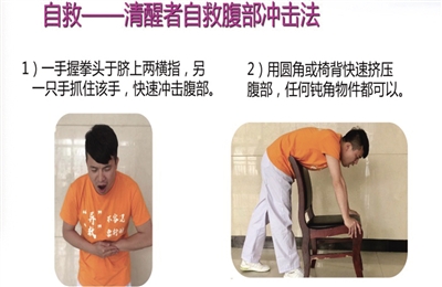 方法三,应用于自救:可采用方法一的2、3、4点,或者稍稍弯下腰去,靠在一固定的水平物体上(如桌子边缘、椅背、扶手栏杆等),以物体边缘压迫上腹部,快速向上冲击,重复之,直到异物排出。