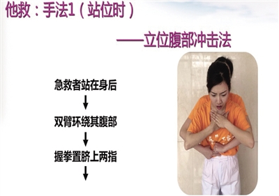 方法一,应用于成人:一、抢救者站在病人背后,用两手臂环绕病人的腰部;二、一手握拳,将拳头的拇指一侧放在病人胸廓上和脐上的腹部;三、用另一手抓住拳头,快速向上重击压迫病人的腹部;四、重复以上手法直到异物排除。