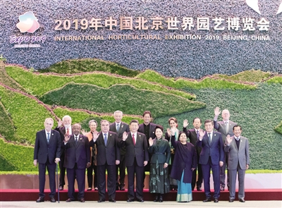 现场奏唱中华人民共和国国歌,五星红旗冉冉升起。伴随雄壮的乐曲声,国际展览局局旗、国际园艺生产者协会会旗、北京世园会会旗依次升起。