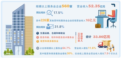 近年来,我市加大规模以上服务业企业上规入库工作力度,积极推动服务业发展。今年一季度,全市560家规上企业共实现营业收入52.35亿元。从行业运行情况看,交通运输、仓储和邮政业,信息传输、软件和信息技术服务业,租赁和商务服务业三大行业占据主体地位,支撑作用明显,三大行业营业收入合计33.86亿元,占全部规模以上服务业64.7%,营业收入增长11.6%。其中租赁和商务服务业增长30%,拉动规上服务业营业收入增长7.9个百分点。三大重点行业实现营业利润2.81亿元,占比86.1%。从行业规模和运行状况看,三大行业继续保持着对规上服务业较强的支撑作用。