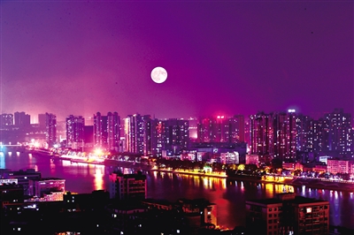 十五的月亮十六圆。9月14日晚,记者用二次曝光的拍摄手法记录下雁城夜空中的满月,皎洁月光与万家灯火交相辉映,美不胜收。 ■记者 罗盟 摄