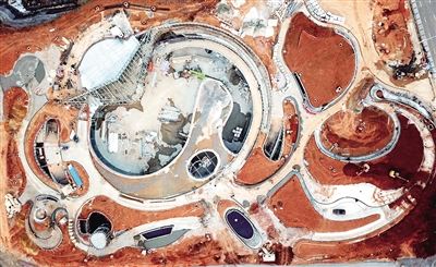 12月10日,湖南华侨城项目建设现场,趁着晴好天气,项目抢抓进度。图为太极造型的窗口建筑——展示营销中心初见雏形。■记者 王 翟 摄