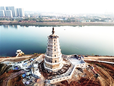 记者在现场看到,经过艰难的清理作业之后,塔体的黑痂被清除掉,裂缝已经闭合,就连须弥座的缺损处也用石材填补了。七层八棱,每个檐角都挂上了青铜风铃。曾经黑黢黢的来雁塔,终于“洗净”铅尘,露出了本来面貌,瞬间“年轻”许多。