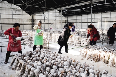 12月16日,衡阳市晖祥生态农业专业合作社蘑菇基地内,务工的村民正在采摘蘑菇。该基地主要生产香菇、秀珍菇和鲜蘑菇,销往北京、长沙、广州、深圳和衡阳本地市场及商超,为当地村民提供60个就业岗位。 ■唐兰荣 摄