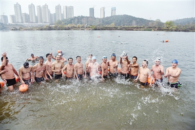 我冬泳,我健康,我快乐。12月22日,来自衡东县、衡山县和南岳区三地的近百名冬泳爱好者齐聚氵米河沿岸,举行迎冬至畅游氵米河活动,挑战严寒,宣扬科学冬泳、安全冬泳的全民健身理念。