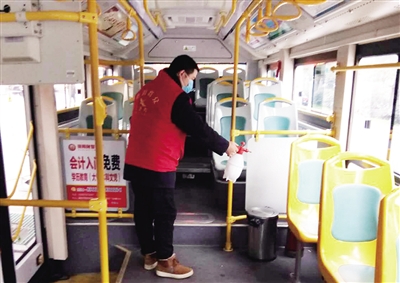 为保障返工返乡返程的乘客出行需要,自10日起,市公交集团调整运力部署,适时加密发车班次,重点增加市中心汽车站、华新汽车站、衡阳火车站、高铁衡阳东站和南岳机场等公交枢纽站场线路的运力。图为司乘人员在对车厢进行消毒。■本报记者 胡亚华 摄