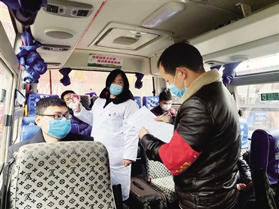 早上8时许,记者在该客运点看到,与以往相比,前来乘车的旅客并不多,即便如此,镇里还是派出了很多工作人员,专门对上下车的乘客进行体温测量,提醒乘客戴好口罩,并逐一对身份信息进行登记备案。