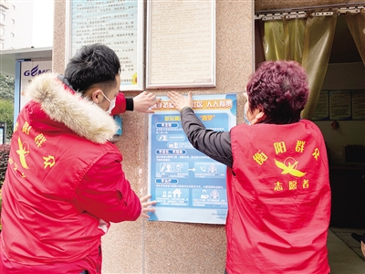 3月5日,是全国第57个“学雷锋纪念日”。在全市人民同心战“疫”的关键时刻,依托全市4000多个“衡阳群众”公共场所学雷锋志愿服务岗(站、亭),以“参与疫情防控 ,服务复工复产”为主题的“3·5”“衡阳群众”学雷锋志愿服务主题实践活动在全市展开。图为高新区“衡阳群众”张贴防疫宣传海报。■记者 张志伟 摄