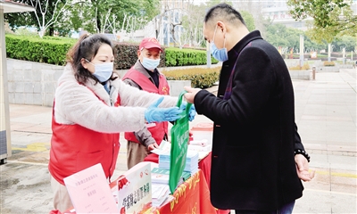 雁峰区南岳电控“衡阳群众”学雷锋志愿服务岗前,志愿者忙着向市民发放新冠肺炎疫情防控知识手册、复工复产疫情防控指南等宣传资料和口罩等防护用品。年逾古稀的社区居民刘恒运大爷对志愿者说:“现在口罩好难买到,感谢你们为我们老百姓送来了‘及时雨’!”