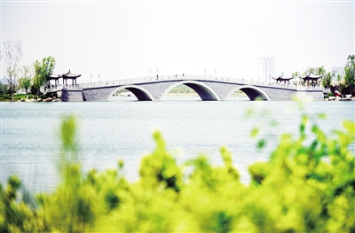 4月13日拍摄的济南华山历史文化湿地公园一景。