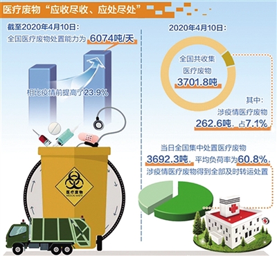 生态环境部固体废物与化学品司副司长周志强表示,目前,全国医疗废物、医疗污水的处理处置平稳有序,没有发现因疫情防控影响环境安全的情况。医疗废物“应收尽收、应处尽处”,基本实现“日产日清”。截至2020年4月10日,全国医疗废物处置能力为6074吨/天,相比疫情前的4902.8吨/天提高了23.9%。4月10日,全国共收集医疗废物3701.8吨,其中涉疫情医疗废物262.6吨,占7.1%。当日全国集中处置医疗废物3692.3吨,平均负荷率为60.8%,涉疫情医疗废物得到全部及时转运处置。自2020年1月20日以来,全国累计处置医疗废物25.2万吨。