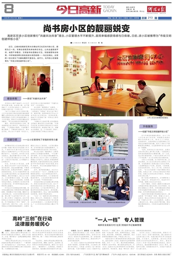 近日,记者来到高新区蒸水办事处祥云社区尚书房小区,眼前为之一亮:车辆全部规范有序地停在车位,公共走道宽阔平坦、地面干净整洁,文明宣传标语随处可见,邻居碰面有说有笑,不时有居民将垃圾投放进分类回收箱……与过去相比,这里的一切已发生了天翻地覆的可喜变化。前不久,尚书房小区被推荐为“市级文明创建样板小区”。