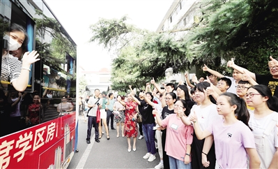 7月6日,衡阳县第一中学,留在本校考点的学生送别赶赴其他定点考点的同学,竖起大拇指为同学点赞、加油。 今天,全国千万考生将迎来高考首日。据教育部消息,2020年全国普通高校招生报名总数为1071万名。 ■腾妮珊 曹正平 摄