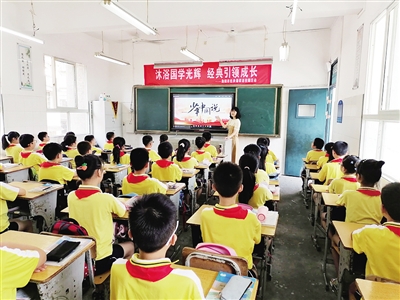 7月7日上午,中南路小学开展“沐浴国学光辉,经典引领成长”经典诵读活动,孩子们在老师的带领下,声情并茂地诵读《少年中国说》《三字经》《弟子规》等,感受国学的魅力。■邓 湘 摄