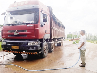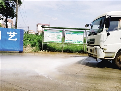 7月7日上午,烈日当空,记者在酃湖公园项目工地看到,洒水车正在冲洗路面,送风式喷雾机正在强劲喷射水雾降尘,工作人员对准备驶出工地的洒水车、运输车、小汽车等各类车辆进行冲洗,裸土被绿色防尘网覆盖。在围挡上、施工区、办公区和生活区,各类创文创卫公益广告、标语标牌、宣传栏等随处可见;工地上,建筑材料堆放有序……