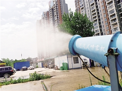 据介绍,对工地所有围挡,项目方进行定时清洗,做到日常清洁,并派专人巡查,如有损坏及时修复;对场内未作业土方进行绿网覆盖,做到集中动土,完工后即全面覆盖;土方作业车控制场内车速,如果不是下雨天,则沿路洒水降尘,土方作业区域及主入口等主要部位雾化机全程开启,并进行PM2.5扬尘常态监测;洒水车对日常道路洒水降尘,对场内及周边道路进行冲洗;要求场内施工材料分区堆放整齐,标识清楚,钢材下垫上盖,零星材料全面覆盖;对施工区域大门实行一进一出,车辆出场前必须冲洗干净;场内建筑垃圾做到归堆、外运,白色垃圾由专人清理。在办公区和生活区,设专人负责保洁,做到日常清理,保持清洁,无乱摆乱放现象,做好病媒生物防治工作。对食堂进行严格管理,保证食品安全,餐具、餐桌等清洁卫生,服从卫生部门的检查监督。