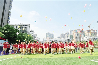 17日上午,高新区祝融小学为2014级毕业生举行毕业典礼,418名毕业生放飞写有自己梦想的气球。