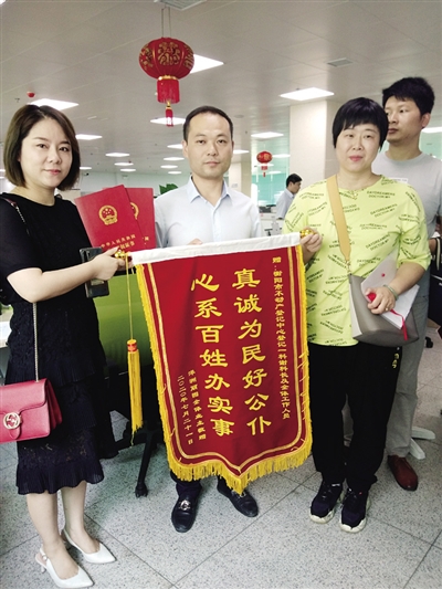 “谢谢你们,为我们解决了困扰多年的问题,用最快的速度,最短的时间,帮我们把不动产证办出来了。”7月22日上午,在市不动产登记中心遗留问题受理专窗前,洋洲丽园四名业主代表怀着感激之情,将一面绣有“真诚为民好公仆 心系百姓办实事”的锦旗送到工作人员手中。寥寥数语,饱含着群众对市不动产登记中心全体人员工作的褒扬和肯定。
