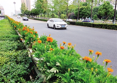昨日下午,记者在解放西路立交桥空中“花卉长廊”看到,或红或黄的花朵串珠成链,秋花美景,夺目抢眼。据介绍,此番编织立交桥“秋装”,最为出彩的花卉为孔雀草。孔雀草花朵共分为黄色及橙色两款,具有花大色艳、叶色翠绿、耐旱能力强、花期较长等优点。