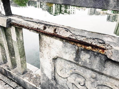 本报讯 (文/图 记者 胡亚华 ) 始建于上世纪五十年代的岳屏公园九曲桥古朴典雅,曲桥卧波,风景如画。连日来,一些游客致电本报新闻热线反映,这座“风景桥”难敌风雨侵蚀,老态尽显,扶栏破裂,钢筋裸露,渴盼修缮。