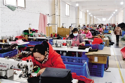 12月22日上午,祁东县灵官镇竹木市场安置点的扶贫车间内一片忙碌景象,机器有序运转,100余名村民有条不紊地制作箱包服饰。近年来,灵官镇镇政府通过发展产业,建设扶贫车间来改善贫困户的生活,有效解决了贫困户家门口就业的问题。 ■周 围 摄
