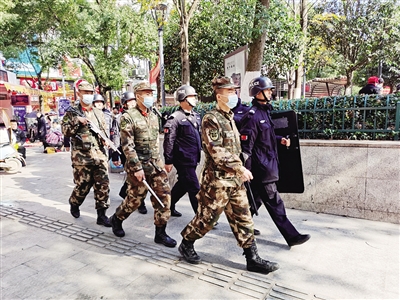 元旦期间,武警衡阳支队每日出动14个巡逻组,对人员密集区、汽车站、火车站、商场等场所进行联勤武装巡逻,加强社会面管控,维护社会秩序,确保社会安全稳定。
