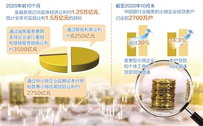 “根据中国人民银行和中国银保监会数据测算,2020年前10个月金融系统已向实体经济让利约1.25万亿元,预计全年可实现让利1.5万亿元的目标。”央行副行长刘国强说。