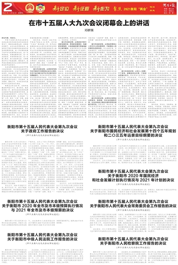 衡阳市第十五届人民代表大会第九次会议经过审查,同意市人民代表大会财政经济委员会的审查报告,决定批准市人民政府提出的《关于衡阳市2020年国民经济和社会发展计划执行情况与2021年计划草案的报告》,批准2021年国民经济和社会发展计划。