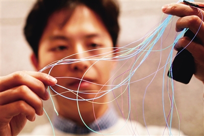 3月10日,复旦大学科研人员展示用于编织的发光纤维。
