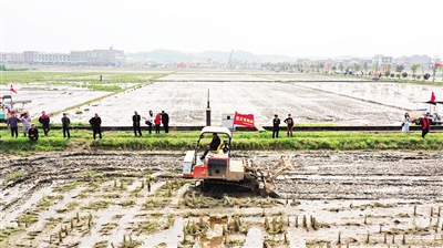 本报讯(文/图 通讯员 文峰 廖晶 曾思灵)3月26日,衡山县白果镇岳北农田示范区里,一台台新型农机来回穿梭,机器轰鸣声响彻一片,一派农机闹春、人勤春早的乡村画面在此徐徐展开。当天,2021年衡山县“田间地头党旗红 百社农机闹春耕”活动在此举行,吹响了春耕生产的号角。