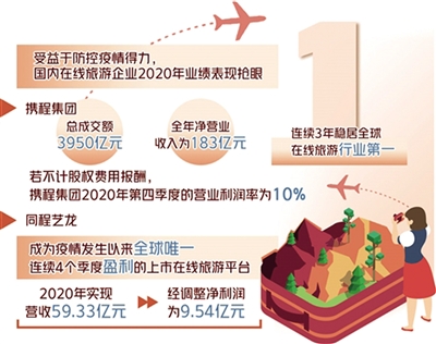 2020年,携程集团总成交额3950亿元,连续3年稳居全球在线旅游行业第一;全年净营业收入为183亿元。若不计股权费用报酬,携程集团2020年第四季度的营业利润率为10%,复苏速度在全球处于领先地位。