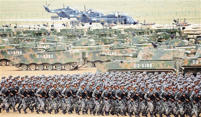 580台(套)地面装备组成32个装备方队,陆、海、空军航空兵160余架战机组成12个空中梯队……受阅装备全部为中国制造,40%为首次亮相,展示出人民军队基本实现机械化、加快迈向信息化的如虹气势。