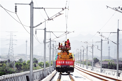 当日,由中国中铁电气化局参建的杭绍台铁路在浙江天台县开始架设第一条接触网导线,标志着杭绍台铁路电气化工程进入核心技术施工阶段。据了解,杭绍台铁路全部接触网导线架设及调整施工计划于7月底完成。