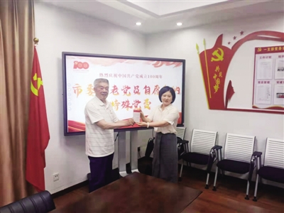 6月8日上午,81岁高龄的老党员阳洪云将5600元特殊党费交到市委办离退休支部负责人手中。入党56年的阳洪云表示:党的百年华诞在即,为感谢党的培养教育,特缴纳5600元特殊党费为“母亲”庆祝生日。 ■本报记者 姚永军 摄
