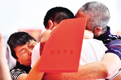 6月8日,在“认亲,我们在行动”济南主会场,张某(左)和吴某林(右)拥抱着被拐的儿子。
