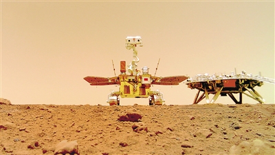 “着巡合影”图,是火星车行驶至着陆平台南向约10米处,释放安装在车底部的分离相机,之后火星车退至着陆平台附近,分离相机拍摄的火星车与着陆平台的合影。图像通过无线信号传送到火星车,再由火星车通过环绕器中继传回地面。