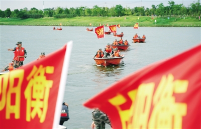 6月16日下午,我市在珠晖区耒水西岸王江渡风光带举行军地联合防汛应急演练活动。本次防汛演练采用汇报演练方式进行。防汛演练科目包括舟艇水上编队表演、地质灾害应急处置、防汛物资“以船代仓”、无人机巡查等。 ■王翟 摄