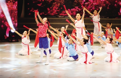 7月11日晚,由团市委主办、市青少年宫承办的“学党史、强信念、跟党走”青少年主题实践暨市青少年宫教学成果展演活动在高新区衡州剧院举行,教育引导广大青少年坚定不移听党话、感党恩、跟党走,厚植爱党情怀。千余名青少年及家长参加或观看展演。 图为孩子们正表演精彩节目。 ■罗盟 摄