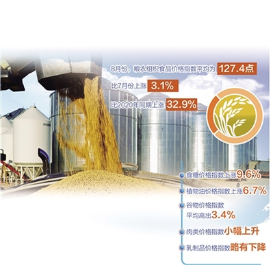 8月份,粮农组织食品价格指数平均为127.4点,比7月份上涨3.1%,比2020年同期上涨32.9%。