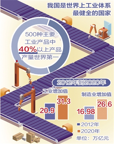 首先,体现在体量大。2012年到2020年,我国工业增加值由20.9万亿元增长到31.3万亿元,其中制造业增加值由16.98万亿元增长到26.6万亿元,占全球比重由22.5%提高到近30%。