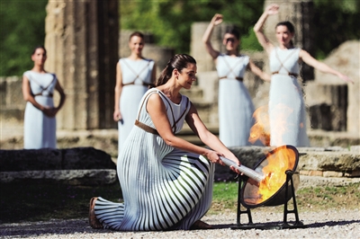 10月18日,扮演最高女祭司的演员乔治乌取得圣火。 当日,北京冬奥会火种在奥林匹克运动的发祥地——希腊伯罗奔尼撒半岛的古奥林匹亚采集成功。在有着两千多年历史的赫拉神庙遗址前,奥运火种再次为北京点燃。■新华社发