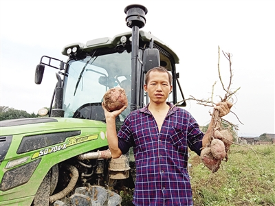 陈德群回到家乡后,决定把不适宜种水稻的农田流转下来,全部种上紫薯。去年11月,他在村干部的大力支持下,成功流转农田110亩,花8万元购置了一台大型拖拉机,用于开荒、耕地、挖紫薯。今年投入20多万元种上紫薯。由于管理到位,今年紫薯获得大丰收。前几天,挖了10来亩紫薯测产量,亩产突破了2000公斤。不少外地客商开着大货车直接到田边收购他的紫薯,一吨卖价达4000元。
